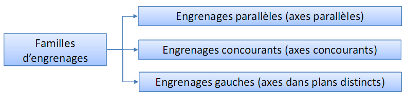 – Les engrenages peuvent se répartir en trois familles selon la position et l’orientation relative de leurs axes :